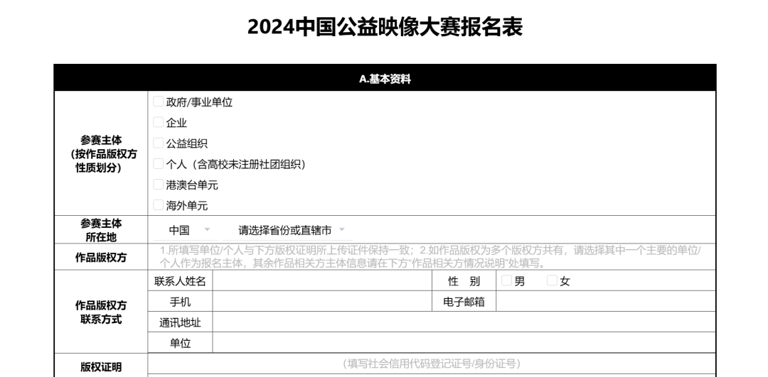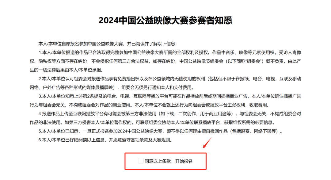 注:請(qǐng)仔細(xì)閱讀《2024中國公益映像大賽參賽者知悉》,同意相關(guān)條款后填寫電子報(bào)名表,并按表內(nèi)要求上傳相應(yīng)證明文件。