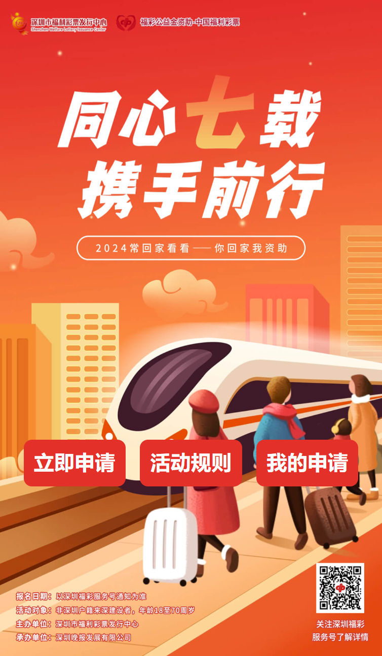 活動(dòng)簡(jiǎn)介:由深圳福彩主辦的“愛心福彩·常回家看看” 第七屆公益活動(dòng)于2024年8月23日至27日啟動(dòng)申請(qǐng)登記。取得資助資格的非深圳戶籍來深建設(shè)者每人最高可獲1000元資助(提交車票據(jù)實(shí)資助)。本次活動(dòng)計(jì)劃投入福彩公益金約90萬元,預(yù)計(jì)提供1200個(gè)資助名額。
