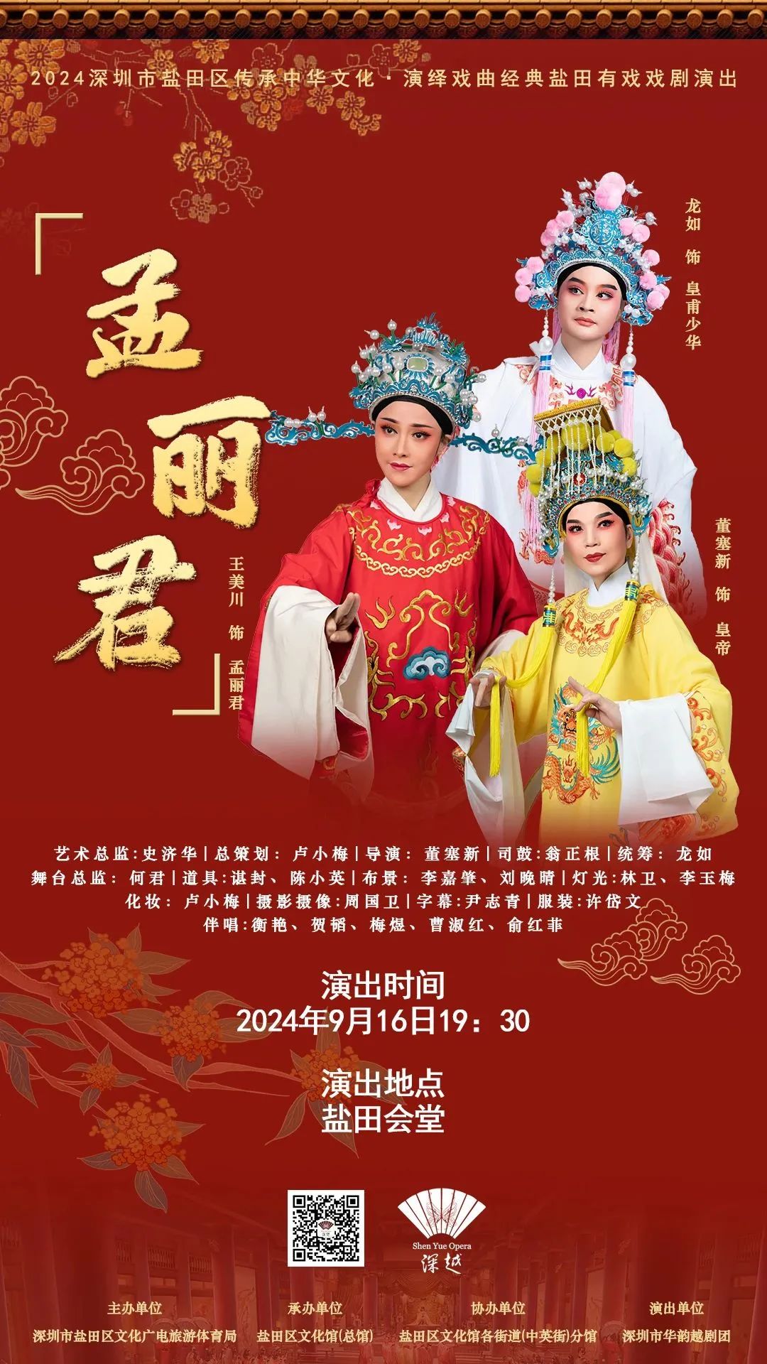 活動簡介:繼《梁山伯與祝英臺》、《五女拜壽》之后,深圳市華韻越劇團再度攜手,為鹽田觀眾帶來越劇經(jīng)典《孟麗君》。這部融合了愛情、智慧與忠義的劇目,將在中秋前夕的鹽田區(qū)文化館璀璨上演。屆時,舞臺上的每一個轉(zhuǎn)身、每一句唱詞,都將帶您領(lǐng)略越劇的獨特魅力,體驗一場視聽盛宴。本場演出為公益免費演出,活動由深圳市鹽田區(qū)文化廣電旅游體育局主辦,鹽田區(qū)文化館(總館)承辦,鹽田區(qū)文化館各街道(中英街)分館協(xié)辦,深圳市華韻越劇團傾情呈現(xiàn)。