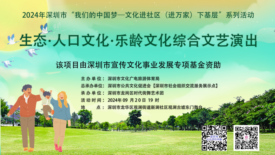 活動簡介:為建設(shè)普惠性、高質(zhì)量、可持續(xù)的城市公共文化服務(wù)體系,深入推進全民藝術(shù)普及工作,豐富市民文化生活,提升市民文化藝術(shù)素養(yǎng),涵養(yǎng)城市人文精神、藝術(shù)精神、科學精神,鼓勵社會力量參與公益文化建設(shè),2024年深圳市“我們的中國夢—文化進社區(qū)(進萬家)下基層”系列活動,將于9月20日在龍華區(qū)觀瀾街道新瀾社區(qū)觀瀾古墟東門舞臺,舉行生態(tài)·人口文化·樂齡文化綜合文藝演出。