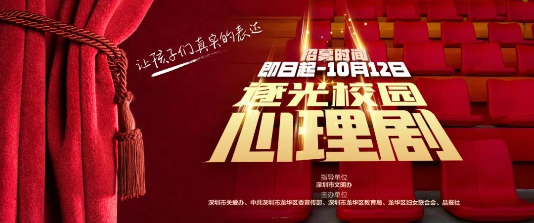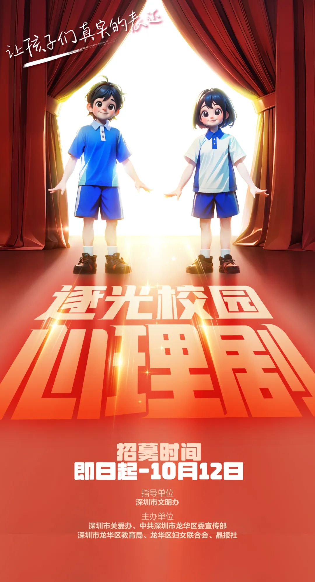 由深圳市文明辦指導(dǎo),深圳市關(guān)愛辦、中共深圳市龍華區(qū)委宣傳部、龍華區(qū)教育局、龍華區(qū)婦女聯(lián)合會(huì)、深圳報(bào)業(yè)集團(tuán)晶報(bào)社聯(lián)合主辦的“逐光校園心理劇巡演活動(dòng)”即日起啟動(dòng)。將面向龍華區(qū)中小學(xué)校進(jìn)行招募,征集原創(chuàng)心理劇劇本,讓青少年在參與的過程中有所思、有所悟,始終保持積極向上的心態(tài),勇敢面對(duì)困難和挑戰(zhàn),追逐自己的夢(mèng)想。