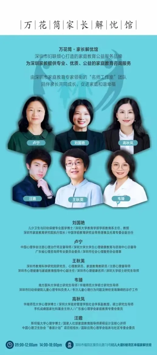 活動(dòng)簡(jiǎn)介:“萬花筒·家長解憂館”是深圳市婦聯(lián)傾心打造的家庭教育公益服務(wù)品牌,通過邀請(qǐng)深圳市家庭教育專家組建“名師工作室”,為深圳家庭提供專業(yè)、優(yōu)質(zhì)的家庭教育咨詢,為深圳家長排憂解難。