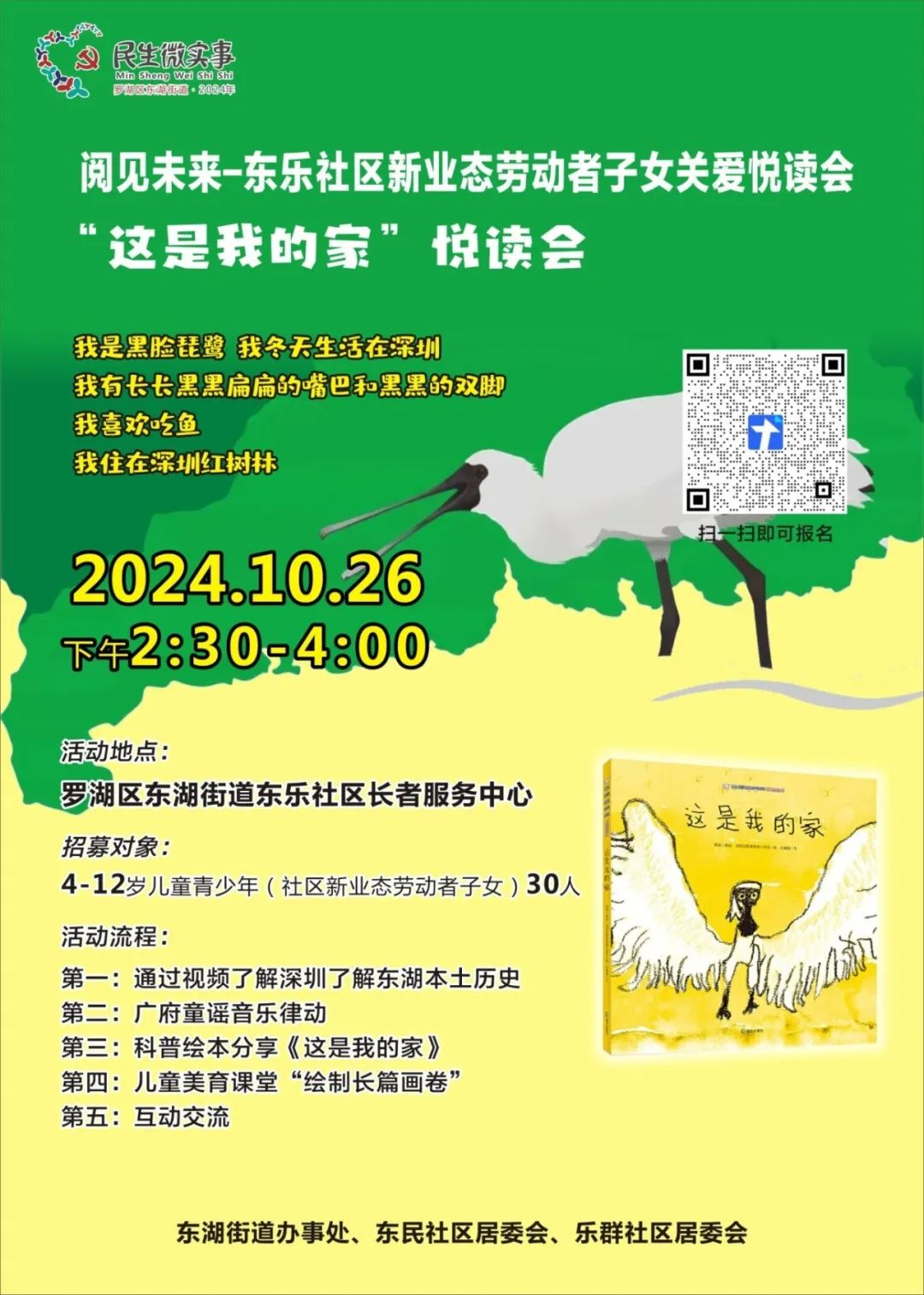 活動(dòng)簡(jiǎn)介:這是一本由深圳市小朋友創(chuàng)作的、以世界上最珍貴的鳥兒——黑臉琵鷺為主角的城市繪本,一本描繪深圳風(fēng)光的導(dǎo)游書。這本飽含著溫情與藝術(shù)特色的,與深圳的人、地理、文化相關(guān)的小小的書,它的誕生有著長長的故事。
