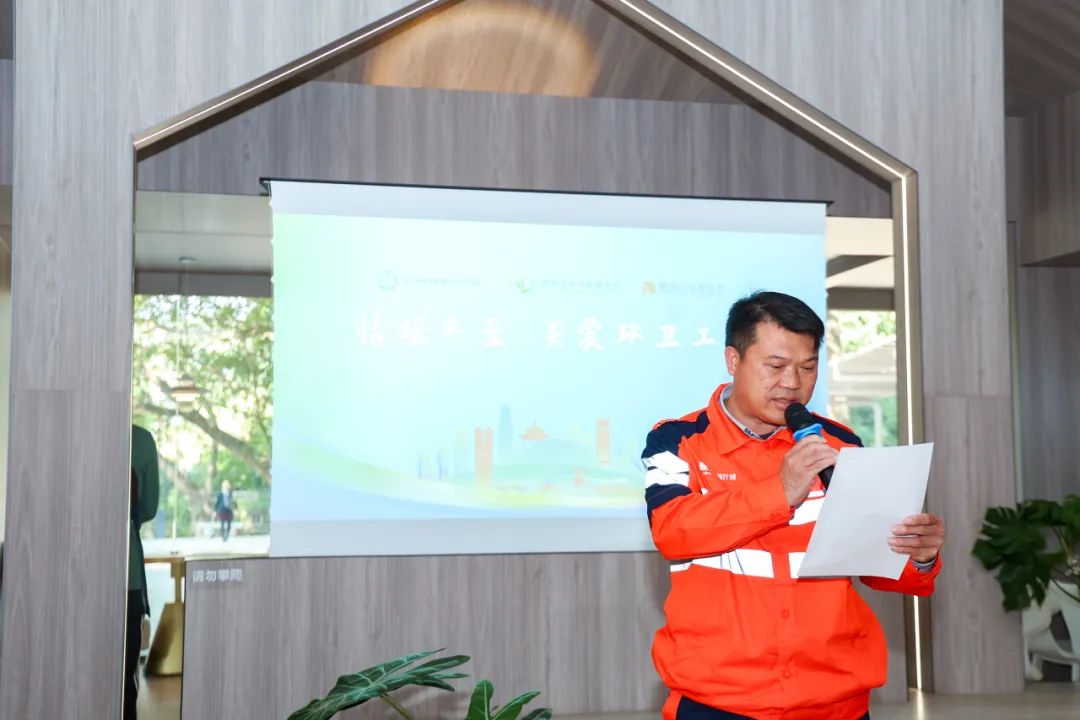 環(huán)衛(wèi)工人代表蔣飛彪來自湖南永州,他已在深圳環(huán)衛(wèi)戰(zhàn)線堅(jiān)守21年。深圳是他的第二故鄉(xiāng),在這里的21年,他見證了城市的飛速發(fā)展,也深深感受到了社會(huì)各界對環(huán)衛(wèi)工人的關(guān)愛。他提到自己因文化程度不高而從事環(huán)衛(wèi)工作,雖家庭遭遇父親早逝、母親生活不能自理的困境,他與同為環(huán)衛(wèi)工人的姐姐一邊工作一邊照顧母親,但社會(huì)給予的幫助讓他堅(jiān)信踏實(shí)肯干就能獲得回報(bào)。他表示,在今后的工作中,一定會(huì)倍加珍惜這份工作,堅(jiān)守崗位,用實(shí)際行動(dòng)守護(hù)深圳的市容環(huán)境,為這座城市的干凈整潔貢獻(xiàn)自己的力量,以回報(bào)各界的信任與厚愛。
