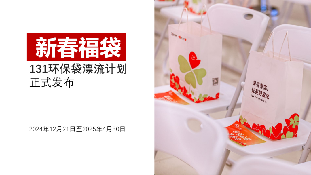 活動(dòng)簡(jiǎn)介:新春福袋131環(huán)保袋漂流行動(dòng),是由深圳市小鴨嘎嘎公益文化促進(jìn)中心聯(lián)合德義慈善·益+小站慈善商店,共同發(fā)起的一次公益行動(dòng)。該行動(dòng)希望通過從關(guān)愛他人的角度去促進(jìn)環(huán)保袋重復(fù)使用,讓更多人從更為生活化的視角探討可持續(xù)的生產(chǎn)和生活方式,探討以“重復(fù)使用”模式有效助力塑料污染治理的可能。