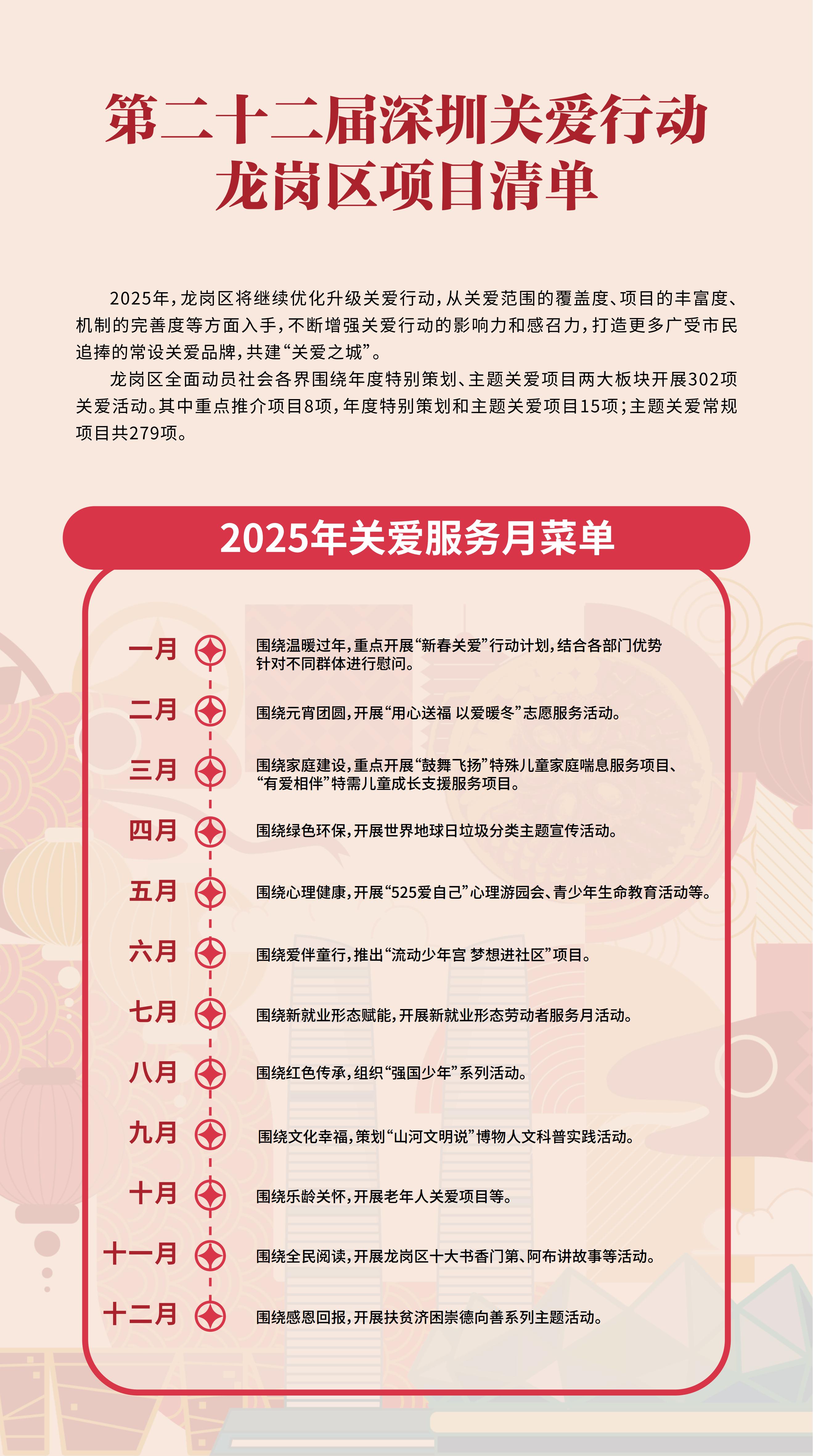 據(jù)了解,“關(guān)愛(ài)+”模式已成為龍崗區(qū)聚焦領(lǐng)域服務(wù),精準(zhǔn)關(guān)愛(ài)“惠民心”的重要舉措之一。龍崗區(qū)各部門(mén)及社會(huì)各界精準(zhǔn)策劃、集中力量推出了一系列契合市民需求和務(wù)實(shí)有效的關(guān)愛(ài)項(xiàng)目,2024年共計(jì)開(kāi)展了180項(xiàng)關(guān)愛(ài)活動(dòng),其中包括精心組織的7項(xiàng)關(guān)愛(ài)行動(dòng)示范項(xiàng)目以及173項(xiàng)重點(diǎn)和常規(guī)項(xiàng)目,涌現(xiàn)出“新春大盆菜 溫暖送到家”、“山河文明說(shuō)”、“文明100+”文明實(shí)踐主題日等一系列品牌活動(dòng),有力推動(dòng)了人民群眾在物質(zhì)和精神上的共同富裕。