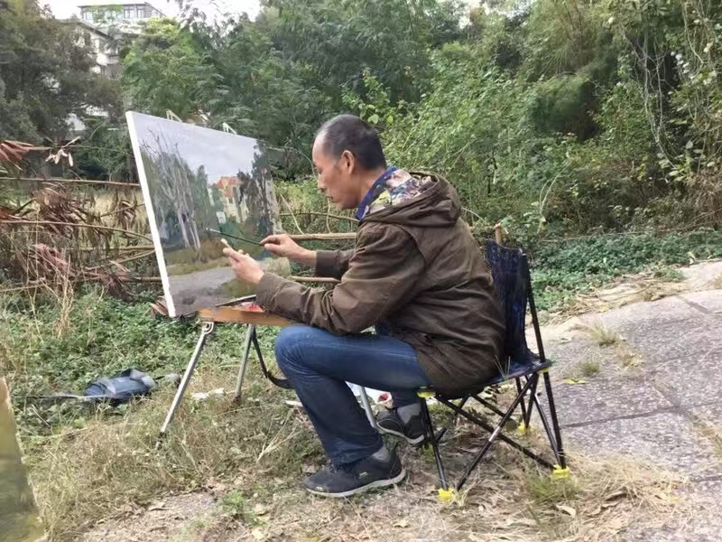 除了堅(jiān)守畫室,蔣慶北還將公益熱情投向了更廣闊的社會(huì)志愿服務(wù)領(lǐng)域。作為大芬油畫村“藝術(shù)大咖”骨干文化志愿者導(dǎo)賞隊(duì)的成員,他常年利用周末時(shí)間,義務(wù)為來自機(jī)關(guān)、社區(qū)、“兩新”組織的黨員和市民群眾參觀團(tuán)擔(dān)任講解工作。他介紹油畫作品創(chuàng)作技法與背景、普及美術(shù)知識(shí)甚至油畫市場(chǎng)的趣聞,語(yǔ)言生動(dòng)、娓娓道來。截至目前,他已累計(jì)完成導(dǎo)賞志愿服務(wù)40余場(chǎng),讓越來越多的人深入了解大芬的人文故事,領(lǐng)略“中國(guó)油畫第一村”的獨(dú)特藝術(shù)魅力。