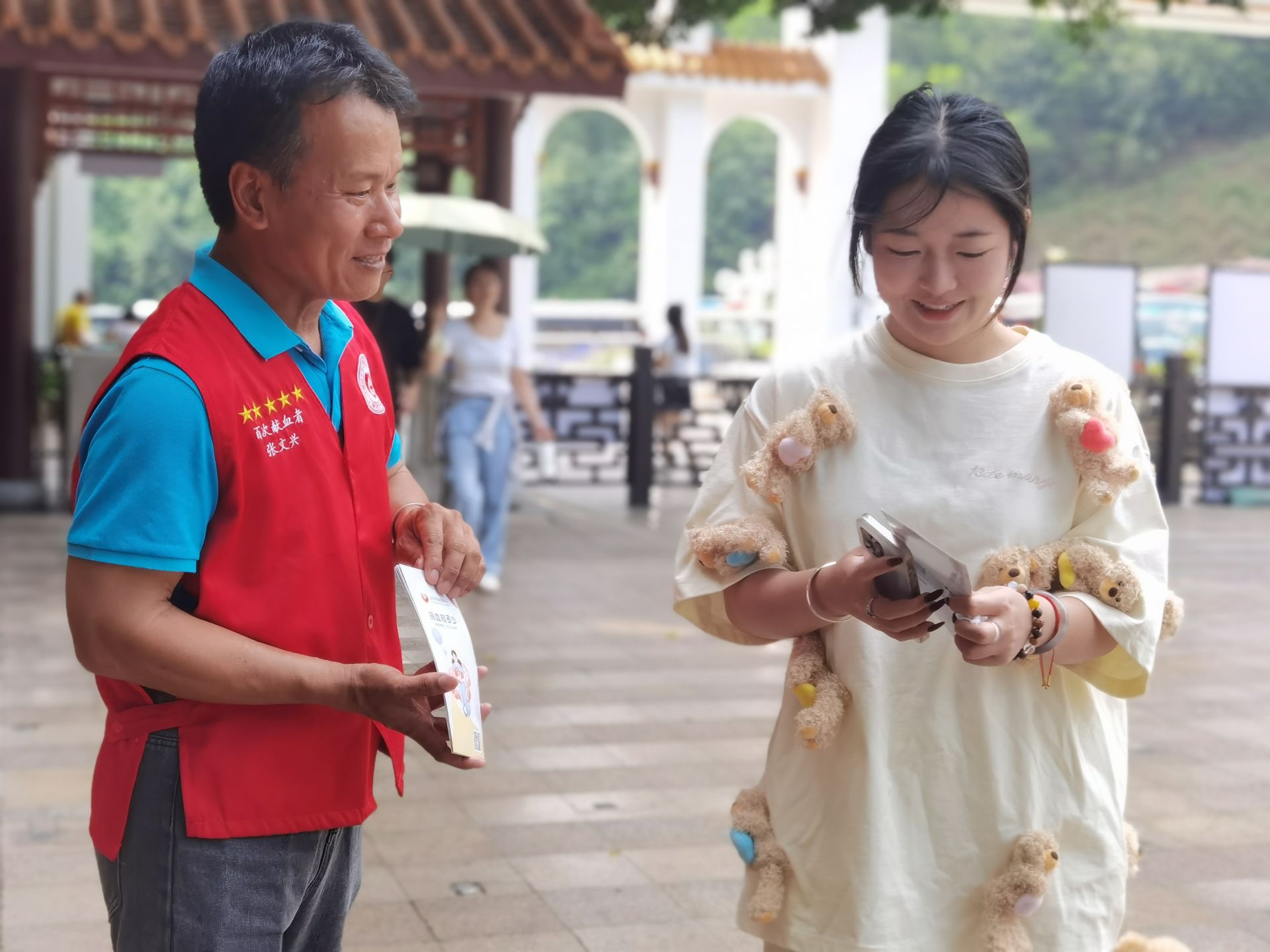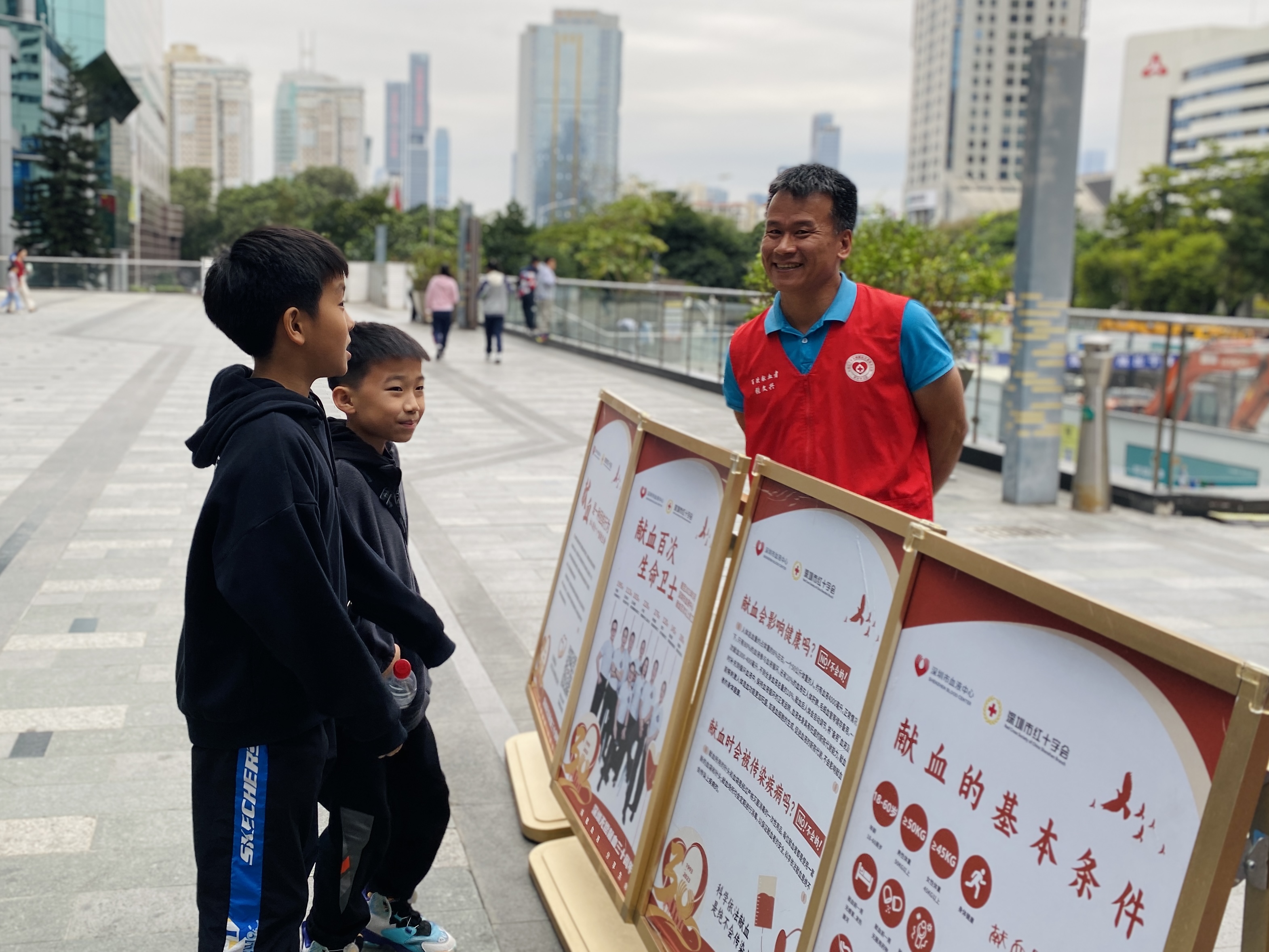 在長期獻血過程中,志愿者的暖心服務讓張文興深刻體會到:“獻血百次,不如勸人獻血一次”。2023年,他主動加入深圳市紅十字會無償獻血志愿工作者服務隊,從無償獻血者,成長為志愿工作者。無論高溫酷暑還是臺風暴雨,他總是堅守在街頭獻血點,用自己的親身經(jīng)歷積極宣傳、主動招募,帶動更多市民加入無償獻血行列?!坝浀糜形荒贻p人聽完我的故事后,不僅自己獻血,還拉著伙伴一起來,那一刻我明白,愛心能傳遞,只要人人都獻出一點愛,世界將變成美好的人間?!睆埼呐d感動地說。截至目前,他的累計志愿服務時長已達4470小時。在兩年多的時間里,他有超過600天堅守在志愿服務一線,有捐血者開玩笑說他是“長期經(jīng)過太陽炙烤的人”。